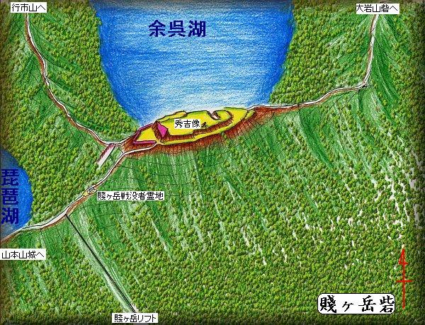 賤ヶ岳砦は、賤ヶ岳の合戦の中心となったところである。北陸自動車道の木之本ICの西1kmほどの所に、山上に登れる近江鉄道経営のリフトがあるので、これを利用すればすぐに山に上がることができる。比高300mほどの山である。