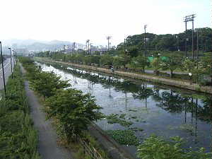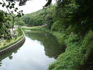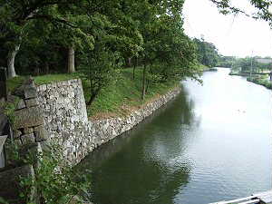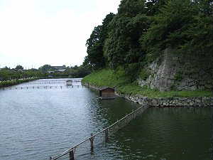 | 彦根城の東の外堀。だいぶ汚れているが、それでもしっかりと残されている。 | 外堀のところから見た彦根城の天守。 |