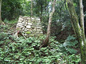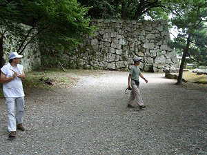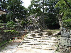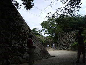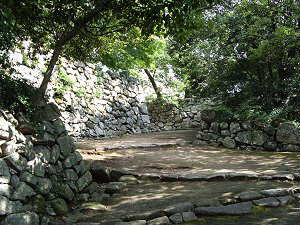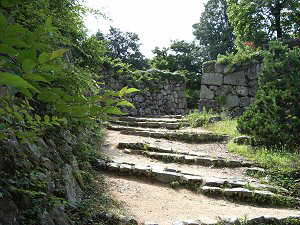 | 西の丸三重櫓である。一説では小谷城天守を移築したものであるともいうが、小谷城に三重の天守があったと言うこと自体があやしいものである。 | 西の丸から下に降りていく道にも何段もの折れが見られる。 |