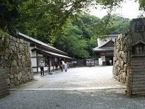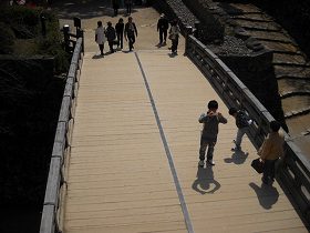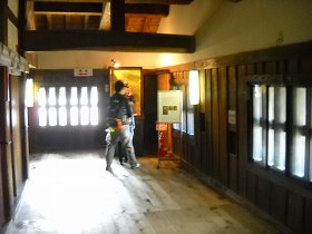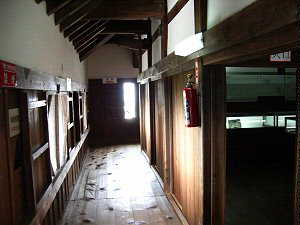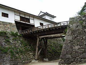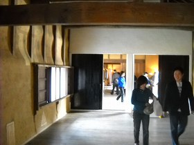 | 天秤櫓から下の木橋を見たところ。ここから敵を迎撃したのである。 | 続いてこちらは、本丸入口の櫓門の内部。 |