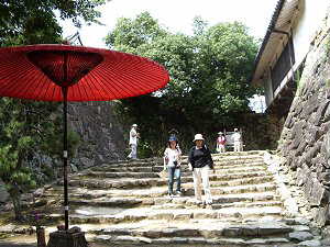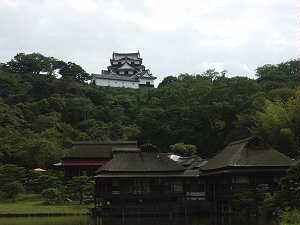 | 本丸の搦め手口。意外と歩きにくい石段が折れながら続いていく。 | 玄宮園からみた天守。彦根城と言えばこのアングルがまず浮かんでくる。 |