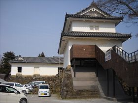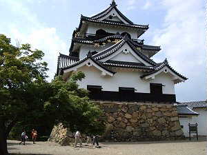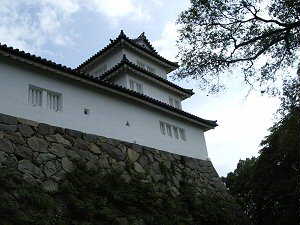 | 本丸入口の門。 | 天守。他の櫓が単純な層塔式であるのに対して、天守だけは古風で装飾の多い造りをしている。大津城から移築したとも言われているが、たしかに城内では異色の建物である。 |