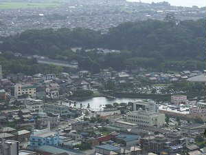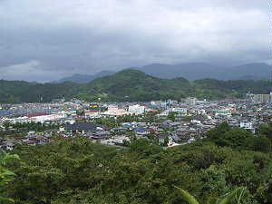 | 彦根城の御殿(彦根城博物館)に入る門の枡形。 | 佐和山城本丸から見た彦根城。まるで箱庭のように見える。 |