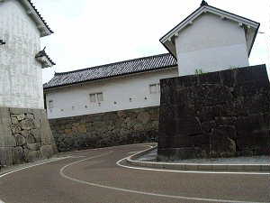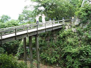 | 本丸と二の丸との間にある天秤櫓。 | 天秤櫓の先の枡形を抜けると本丸への登城口がある。道は左右に折れ曲がっている。 |