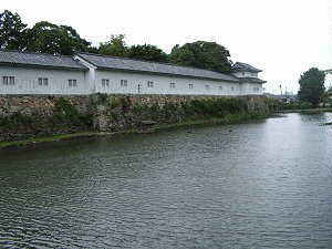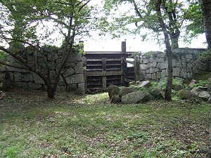 | 大手周辺の石垣と堀。鉢巻き石垣と腰巻き石垣の両方がある。 | 大手口の枡形。かつては櫓門と塀があったはずである。 |