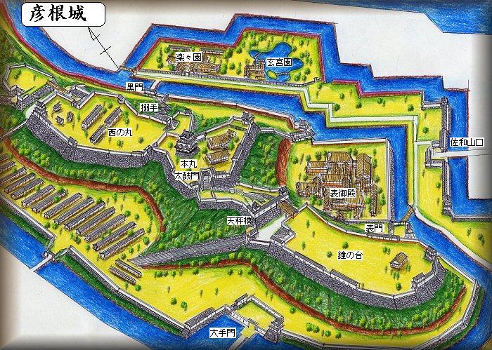 城の中心部は比高30mほどの金亀山を利用したもので、本丸、西の丸、鐘の台と3つの郭を配置しているが、それほど広いものではない。表御殿などの主要な施設は金亀山の麓にあった。これらの施設を含めて、金亀山の周囲には幅20m以上もある堀が掘られ、要所要所に高石垣を築いている。これが内堀である。その外側にも石垣を巡らせて中堀が掘られている。さらにその北側には琵琶湖の水を利用した外堀も掘られていた。天守閣だけ見ると彦根城は古風なイメージがあるが、実際には白亜の壁や櫓、石垣を巡らせた立派な近世城郭であった。