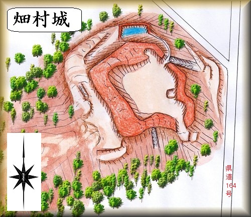 県道164号線から北西に入り込んで行く道の南西側一帯の台地先端部分が畑村城の跡である。