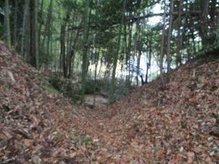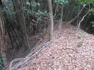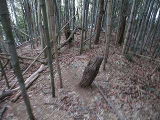 堀切は竪堀となっており、それを降って行くと、中央の山稜方向に向かう切通しの通路の所に出た。この切通し通路を通って山稜奥の方に進んで行く。