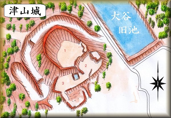 津山城は、太谷旧池の西側に位置する台地縁部を利用して築かれている。