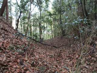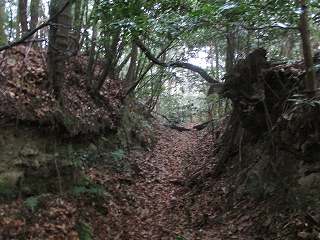 | 東城背後の堀切。 | 山稜部に続く切通しの山道。 |