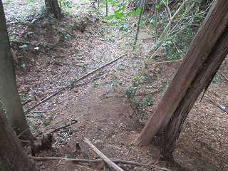 なお、2郭の下から西側下方に続いて行く道があったので、ここから降りてみたのだが、最後は民家の裏に出てしまった。この道は通らず、素直に北側の墓地の所に戻って降って行く方がよいと思われる。