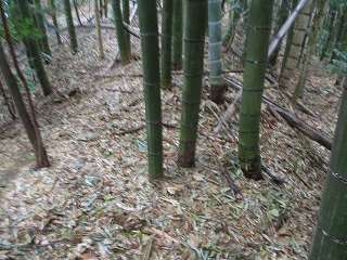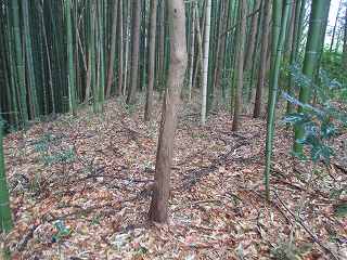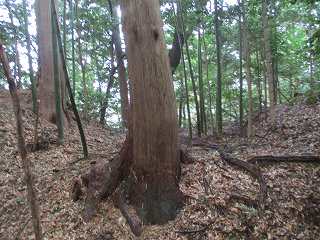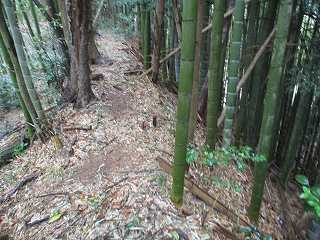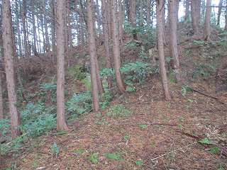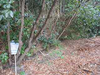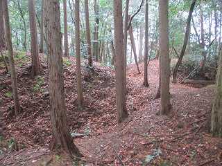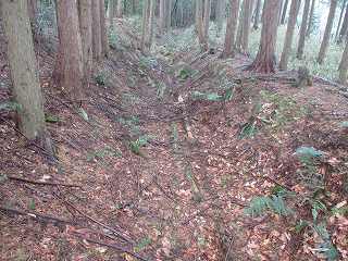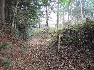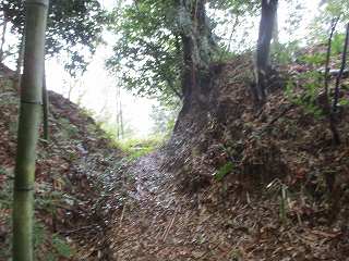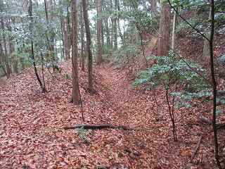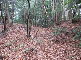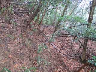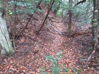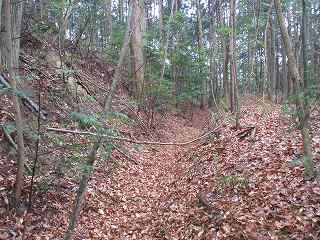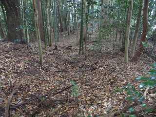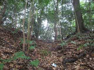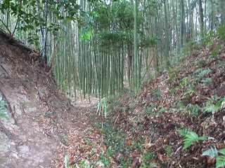 | 尾根伝いに歩いて1郭の虎口が見えてきた。 | 1郭北側の横堀。 |