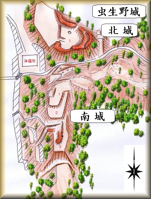 北虫生野城北城の場所。 北虫生野城南城の場所。