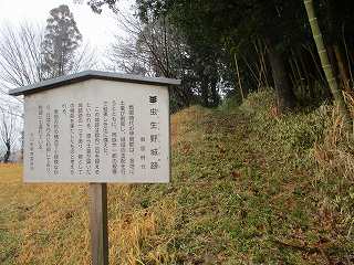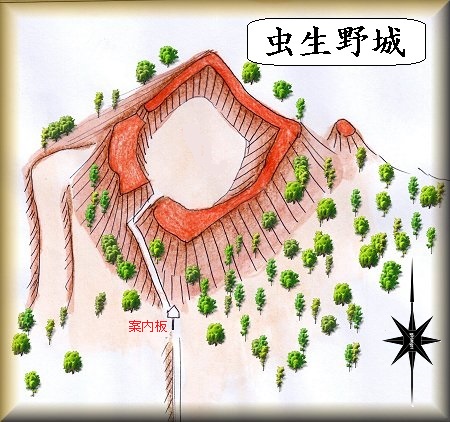 西側の土手に登って行く道があったので、これを進んで行った所、南側の登城道入口に到達した。ここに「虫生野城」の案内板が設置されていた。