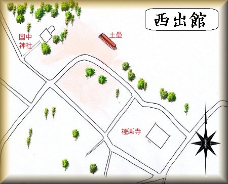 山中氏屋敷から極楽寺の脇を透って国中神社の方に進んで行くと、途中の水田中に土塁がわずかに残されている。これが西出館の遺構であるという。
