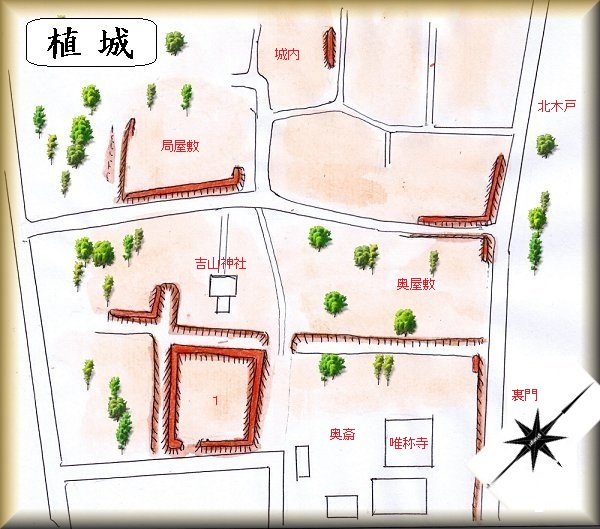 植にある唯称寺や吉山神社の周辺には土塁や堀が点在しており、城館の名残を示している。