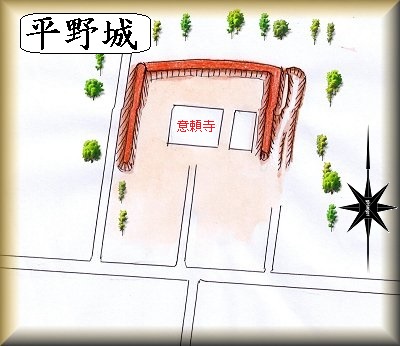 和野の集落の北側にある意頼寺が平野城の跡であり、南側を除く三方向に土塁が残されている。