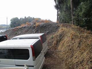 | 堀。 | 土塁。城の郭が削られて駐車スペースとなっていた。 |
