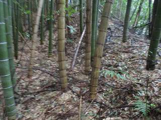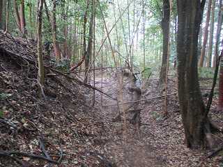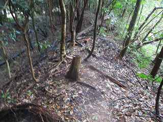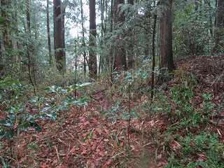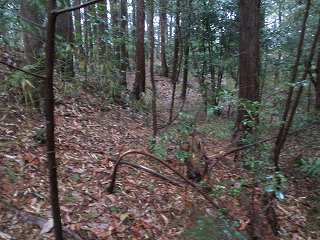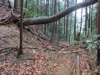 車を山麓の道路の余白に停めて登り口を探す。南側から山稜に入って行く道があったので、これを進んで行ったのだが、途中で道は途絶えてしまっていた。周囲も鋭い切岸になっている。