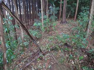 公民館の背後の山林に入って行くと、すぐに堀と土塁が見えてくる。だいぶ破壊が進んではいるが、残存する土塁と堀から、少なくとも土塁で囲まれた3つの郭が想定できるであろう。