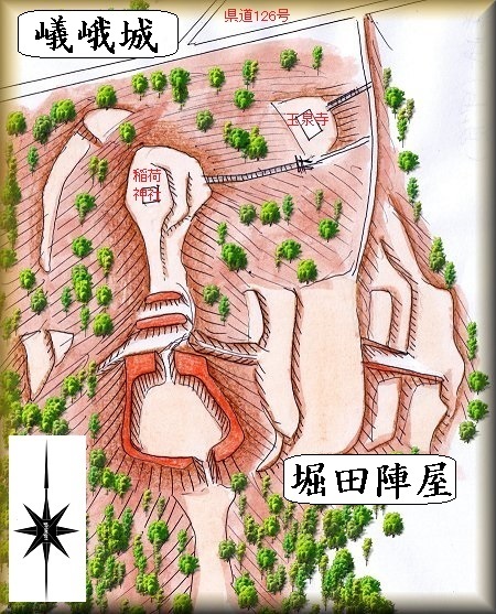 嶬峨城の中腹には玉泉寺があり、また城内には稲荷神社が祭られている。県道126号線から獣除けの柵を開ければ、車で玉泉寺まで行くこともできるが、それが分からなかったので、車は県道脇の道路の路肩に停めさせていただいて、後は歩いてアクセスした。