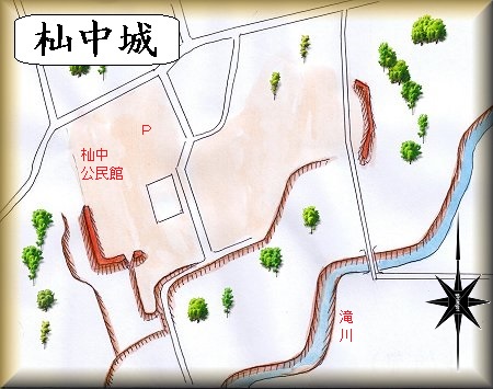 杣中公民館が杣中城の跡なので、この公民館を目指して行けばよい。車も公民館の広い駐車場に停めておくことができる。滝川に臨む台地縁部に位置している。