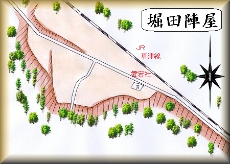 JR草津線の南側に台地が南端に突き出したような地形が見えている。この一帯に堀田陣屋があったという。