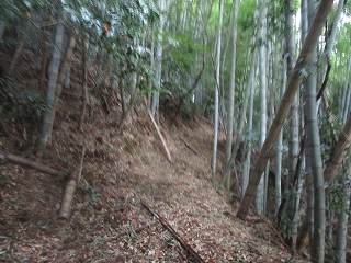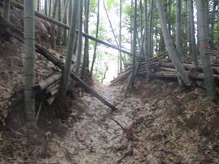 2郭と3郭との間の堀切から南側にかけて道が付けられていたので、これを降って行くことにしてみた。すると、途中がヤブになってはいたが、土手を通って下の道路まで降りていくことができた。だが、この道は知らなければ下から登って行くことは難しいであろう。