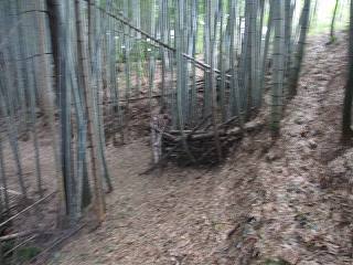 1郭下の堀切のすぐ南側には民家が見えていた。南側の民家を経由すると、簡単に城内まで入れそうであったが、それを避けるためには北側のヤブ地帯を抜けてくるしかない。