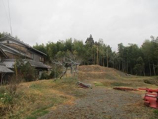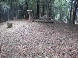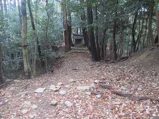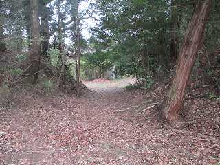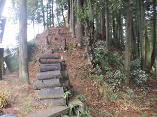 1郭の北側には土塁の切れ部分があり、そこが尾根となって北東側に長く延びている。そしてその上には神社が祭られていた。わりとしっかりとした道が付けられていたのは、この神社への参道であったようだ。