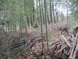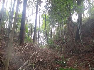 登城道を進んで行った所、先端の削られた場所まで到達した。ここから2郭方向に進もうとしたのだが、ヤブがひどくて進んで行けなかった。1郭2郭に入るためには登城道の途中から斜面を直登した方が早い。