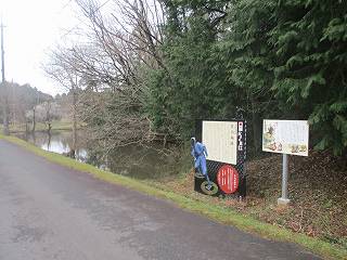 佐治城のある台地上に登り、枡形池の方に進んで行く。枡形池の脇に城の案内板が立てられているので、そこが城の入口であることが分かる。