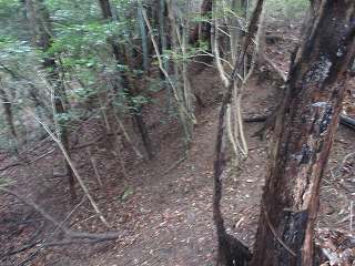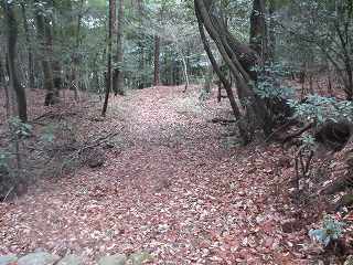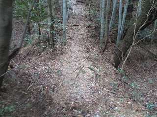 山麓からヤブをかき分けて行くと、山道と遭遇した。この山道は、側面部を長く通りながらやがて台地上の1郭に登って行くようになっている。わりとしっかりとした道である。