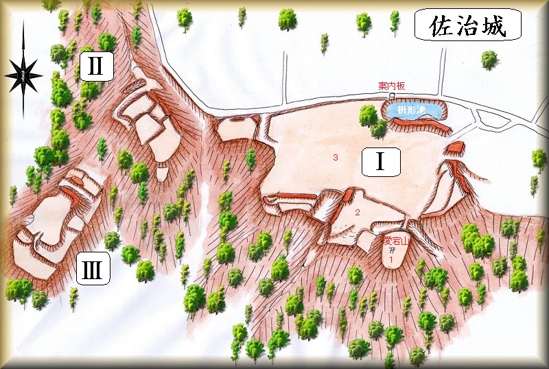 枡形池の背後の2が見通しの良い広場となっている。この部分が実質的に佐治城の主要部分であった可能性があると思われる。