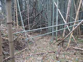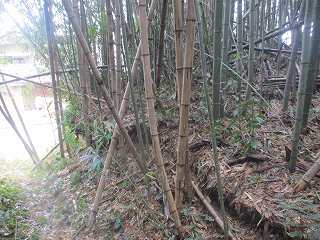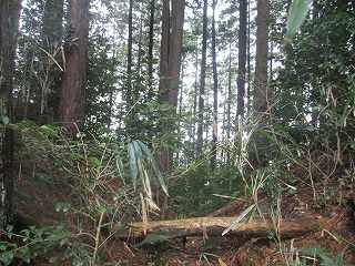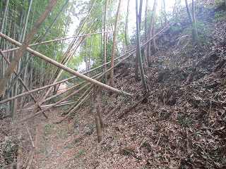 南側中央に虎口状の切れがあるので、そこから内部に入り込んでみる。ところが郭内は竹が密集していて、形状を把握するのが困難な状況となっている。