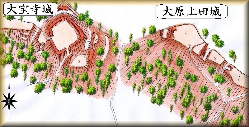 大宝寺城の場所。 大原上田城の場所。