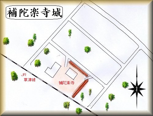 JR草津線の線路の脇にある補陀楽寺が、城館の跡であるという。寺院の中まで車で入って行けるので、車は境内に停めておくことが可能である。城への入口は北西側と北東側の2か所ある。