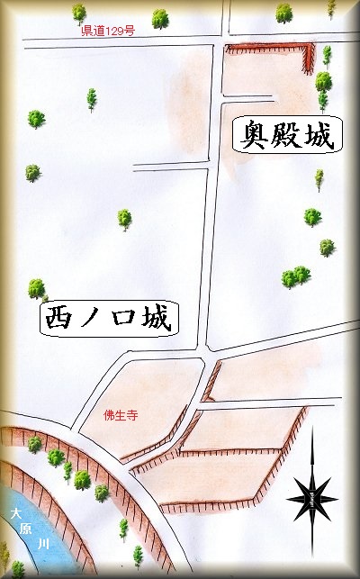 奥殿城の場所。 西ノ口城の場所。