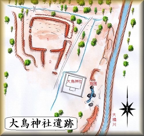 大鳥神社の背後に城館遺構が埋もれている。ということなので大鳥神社を目指して行けばよい。車は神社の駐車場に停めておくことが可能である。