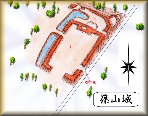 城の周囲には土塁が巡らされており、東側の道路沿いは土手となっている。この道路を進んで行くと、途中に虎口があり、そこに篠山城の案内板が設置されているのが見えてくる。