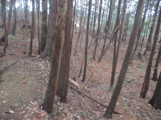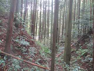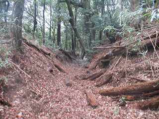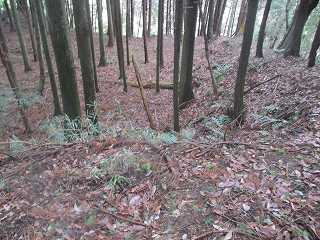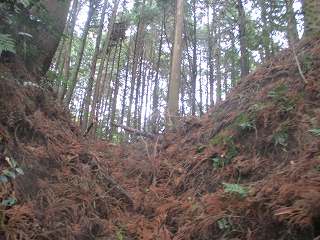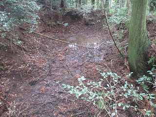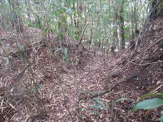 | 富田山城から尾根伝いに東側に進んで行くと、観音堂城との間の堀切が見えてくる。 | 堀切。 |