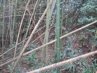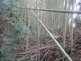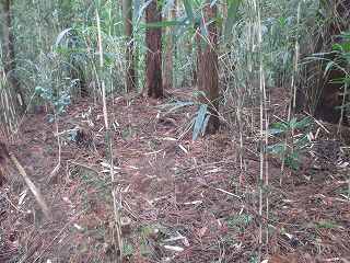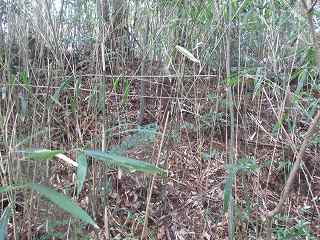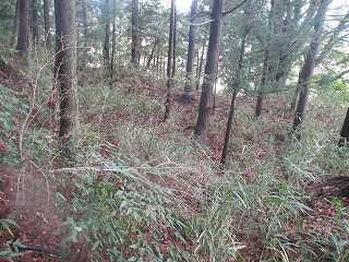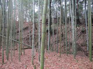 内部は長軸30mほどの半円形の区画となっており、周囲には土塁と堀が巡らされているのだが、竹が密集しすぎていて、その形状は分かりにくくなっている。