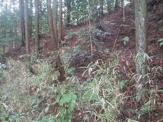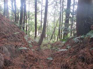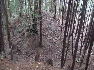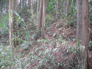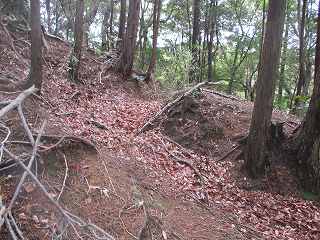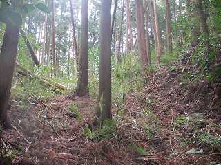 | 3郭西端の堀切。 | 4郭背後の横堀。斜面途中を楕円形に削っている。 |