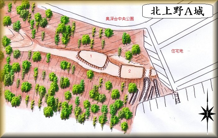 北上野の住宅地に面する山稜の先端部が北上野A城の跡であったという。先端が削られており、下の道路は比較的幅が広くなっている。