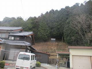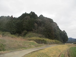 | 東側から遠望する富田山城。先端下に柵の開口部がある。 | 斜面の途中にある観音堂。ここから尾根に登って行く。 |