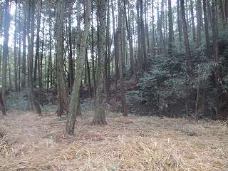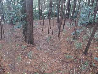 | 1郭内部。北側に高土塁があり、上が櫓台になっている。 | 背後の大堀切。 |