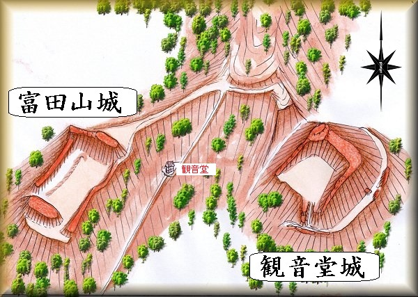 富田山城の場所。 観音堂城の場所。 観音堂入口の柵を開けられる場所。