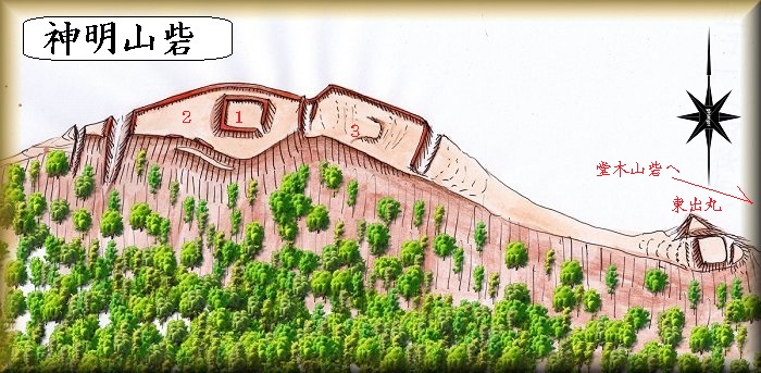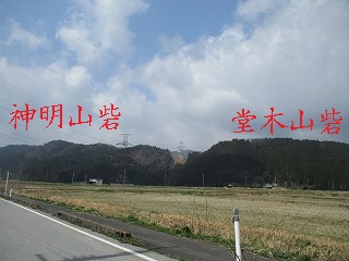 堂木山砦と尾根続きの西方にある比高150mほどの神明山が、神明山砦の跡である。