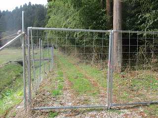 | 南側から遠望する堂木山砦と神明山砦。 | 入口にある鉄柵。これを開けて入って行く。 |