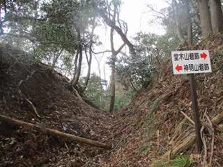 | するとすぐ先に案内表示が。この案内の所から山に入って行くのだが、入口に竹が生えていて分かりづらいんだなあ、これが。 | 尾根部分に出た。堀切になっている。ここを右手に登れば堂木山砦。左に登れば神明山砦。 |